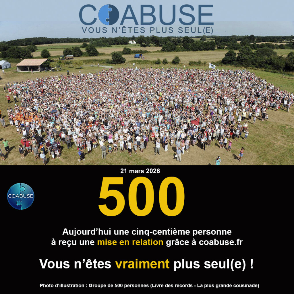 Cela n’engage à rien, c’est souvent un premier pas vers une libération de la parole salvatrice. Coabuse est un outil unique et inédit pour espérer rencontrer un coabusé et vous permettre d’engager une discussion apaisante. Communiquer avec un ou plusieurs coabusé(s) peut vous donner une sérénité et une force que vous n’imaginez pas. Quel que soit votre âge et l’ancienneté des faits, ces rencontres peuvent jouer un rôle clé dans le cheminement vers la guérison et la reconstruction. Un seul objectif : la résilience.