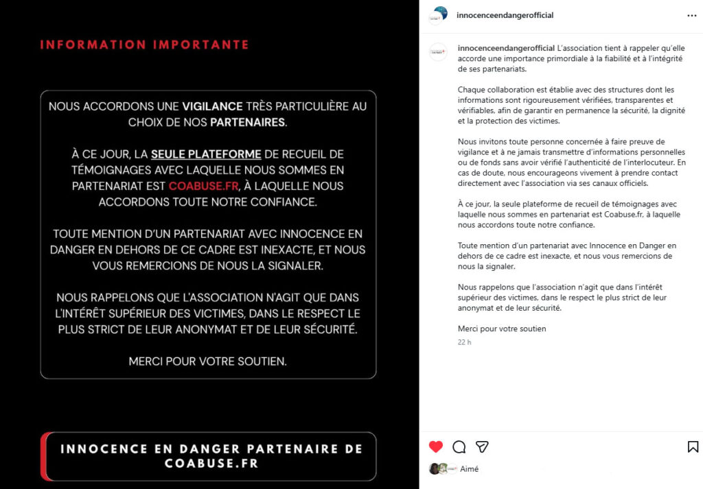Toute mention d’un partenariat avec Innocence en Danger en dehors de ce cadre est inexacte, et nous vous remercions de nous la signaler.