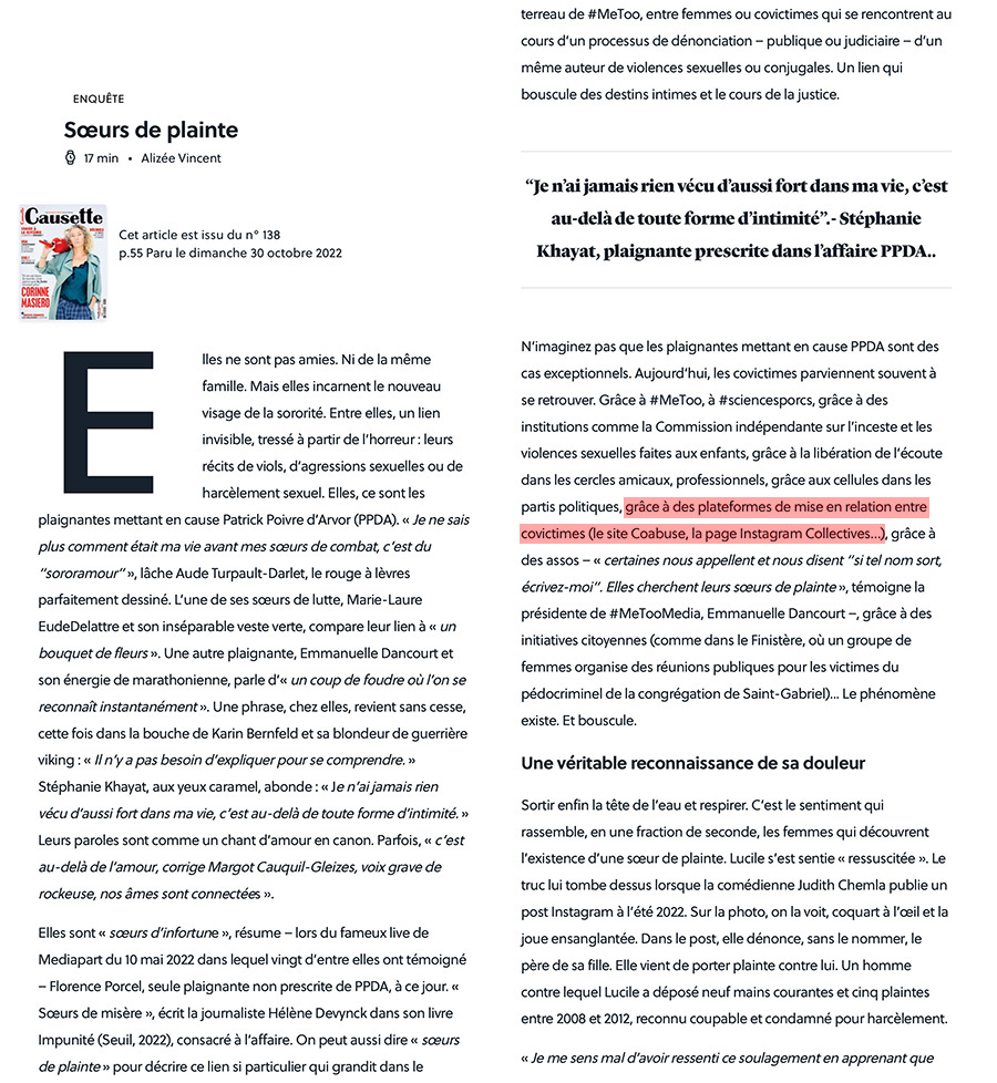 “Aujourd’hui, les covictimes parviennent souvent à se retrouver…grâce à des plateformes de mise en relation (le site Coabuse)”